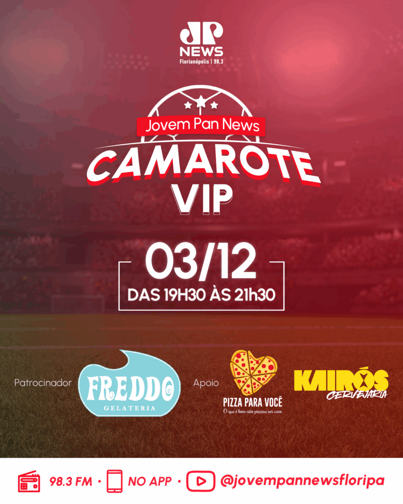Mais do que um evento, o Camarote VIP Jovem Pan News é um encontro de histórias, vivências e sabores. Uma celebração do esporte catarinense, temperada pela vista deslumbrante do rooftop e pelo congraçamento que faz desta noite um momento único. Acompanhe tudo pelos 98,3 FM, pelo aplicativo da Jovem Pan e em imagens no YouTube da Jovem Pan News Floripa.