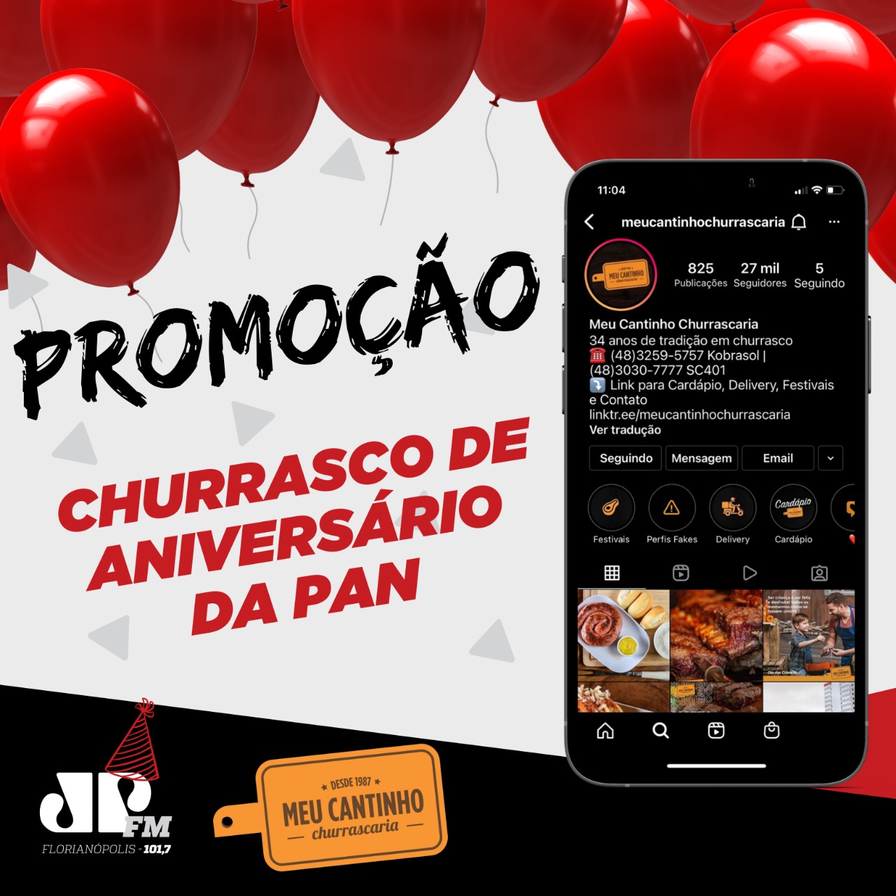 Novembro é o mês de aniversário da Pan Floripa. São 24 anos de história. E pra celebrar essa data, a rádio lançou uma promoção que vai contemplar 2 ouvintes para curtir um churrasco com a equipe de comunicadores da Jovem Pan Floripa, com direito a acompanhante e tudo pago no restaurante “Meu Cantinho”.