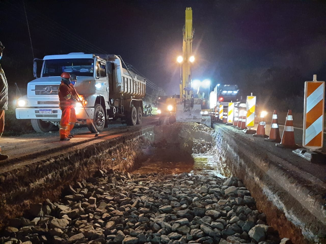 A atividade de reconstrução ocorre em segmento previamente mapeado em que a manutenção superficial já não é mais suficiente. Por isso, as equipes realizam a escavação (entre 75 cm e 1,25 m) e reconstrução da pista no trecho da obra. Ao todo, serão reconstruídos 200 metros nesse trecho – sendo cerca de 50 metros por noite.