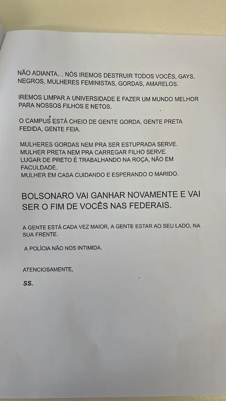 A Polícia Civil investiga mais um caso de nazismo na UFSC. Uma carta, encaminhada na sexta-feira ao Centro de Ciências Jurídicas, CCJ, prega o ódio contra gays, feministas, negros e “amarelos”. A carta não é manuscrita, ela foi impressa e tem como assinatura a abreviação SS, que representa o exército nazista na Segunda Guerra Mundial.