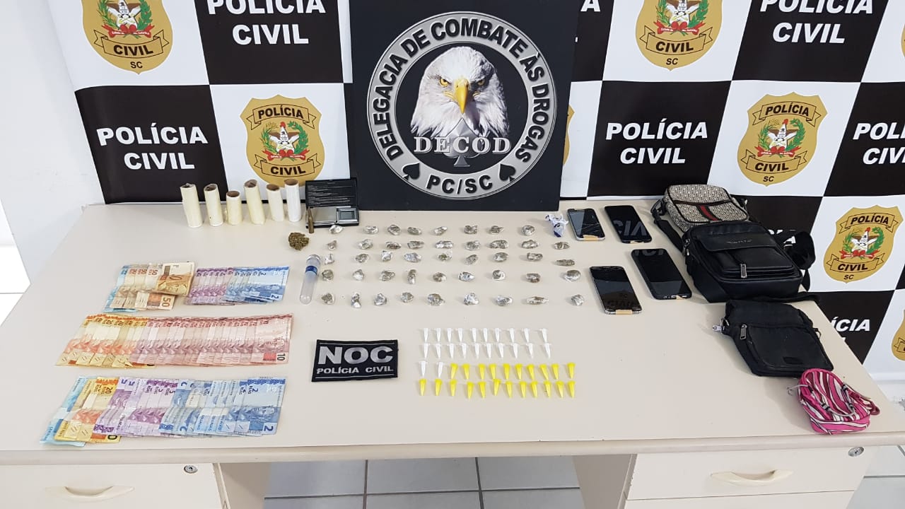 A Polícia Civil prendeu dois homens em flagrante por tráfico de drogas no bairro Ingleses, em Florianópolis, na tarde de segunda-feira (7). Foram apreendidas substâncias análogas a cocaína e maconha, além de uma balança de precisão e uma munição de fuzil.