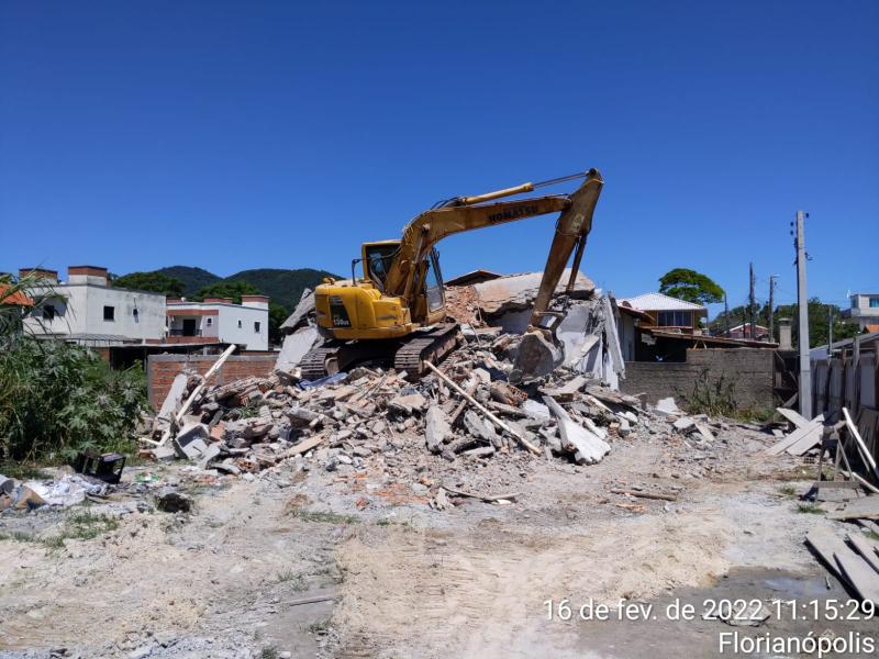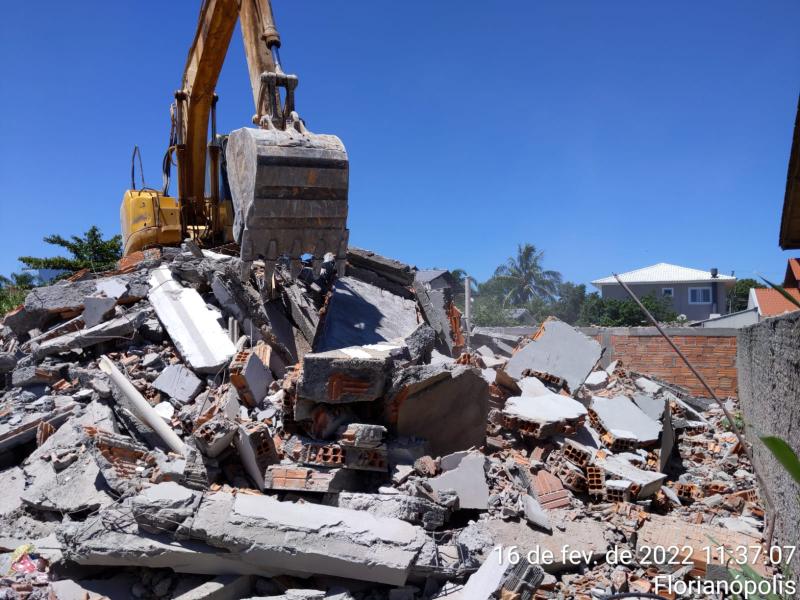 Três imóveis foram demolidos nesta quarta-feira (16) pela Prefeitura de Florianópolis, no bairro Ingleses. Duas casas de dois pavimentos foram demolidas totalmente, e um prédio de seis pavimentos foi demolido parcialmente. Segundo a prefeitura, as obras apresentavam irregularidades e falta de alvará e licenciamento, em desacordo com a legislação da cidade.