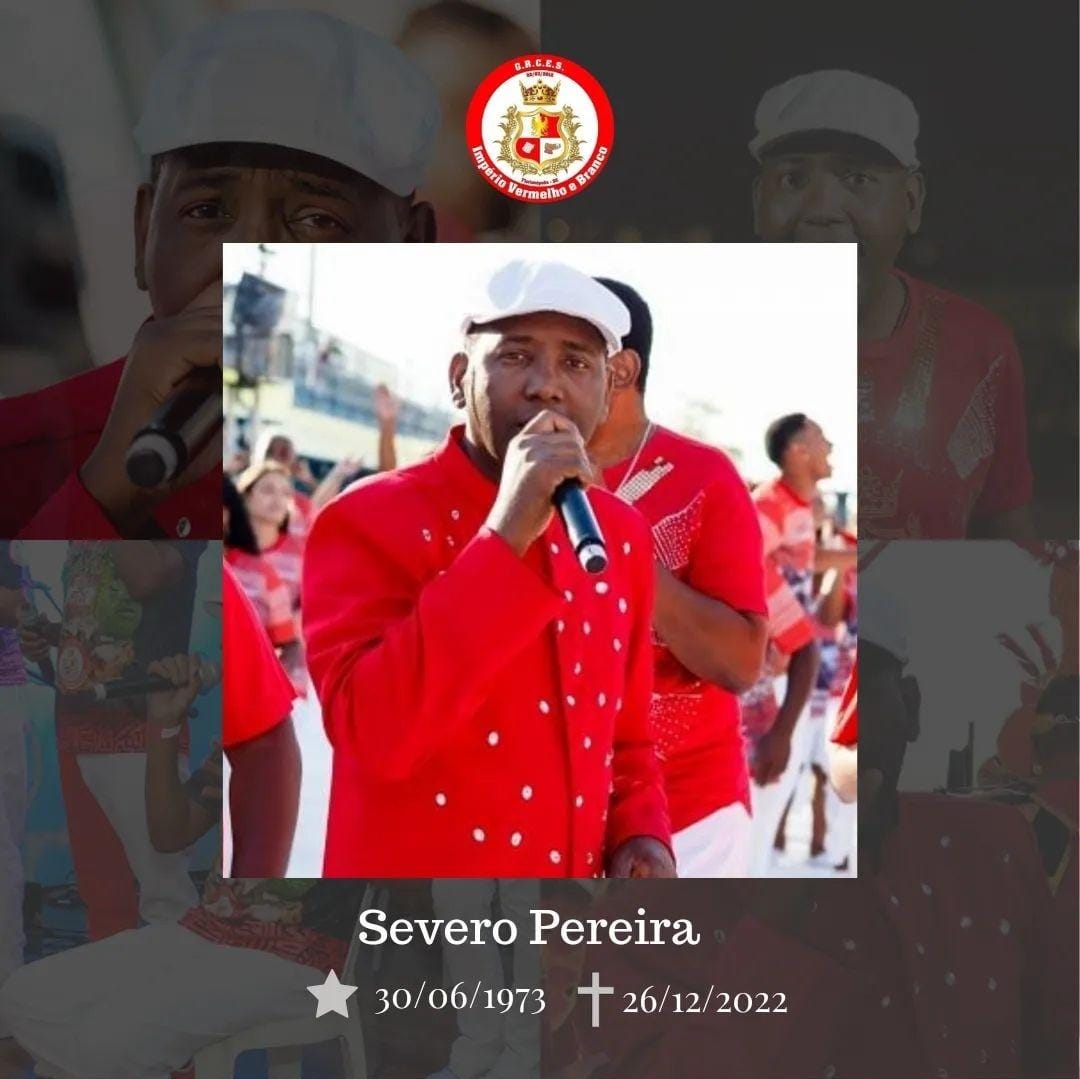 Morreu na madrugada desta segunda-feira (26), o interprete oficial da escola de samba Império Vermelho e Branco, Severino Pereira da Silva, o Severo Pereira. Ele tinha 49 anos e lutava contra um câncer. O falecimento ocorreu no Hospital S.O.S Cárdio.