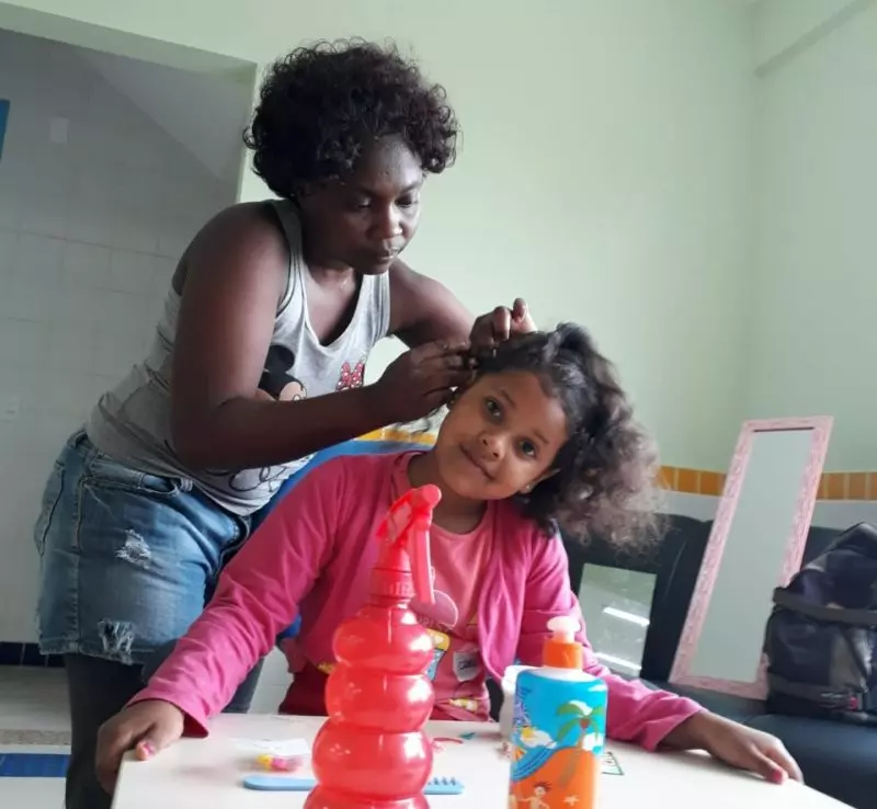 Nesta terça-feira (18) o Núcleo de Educação Infantil Vó Terezinha, na Comunidade Santa Vitória, no bairro Agronômica, promoveu o “dia da beleza nagô” para alunos matriculados na escola. A ação foi coordenada por duas mães haitianas: Falone Paraíso, mãe de Felipe Ryan, de um ano, e Milenne Djon, mãe de Milenne e Djanesca, de dois anos, e Walandy, de cinco anos.