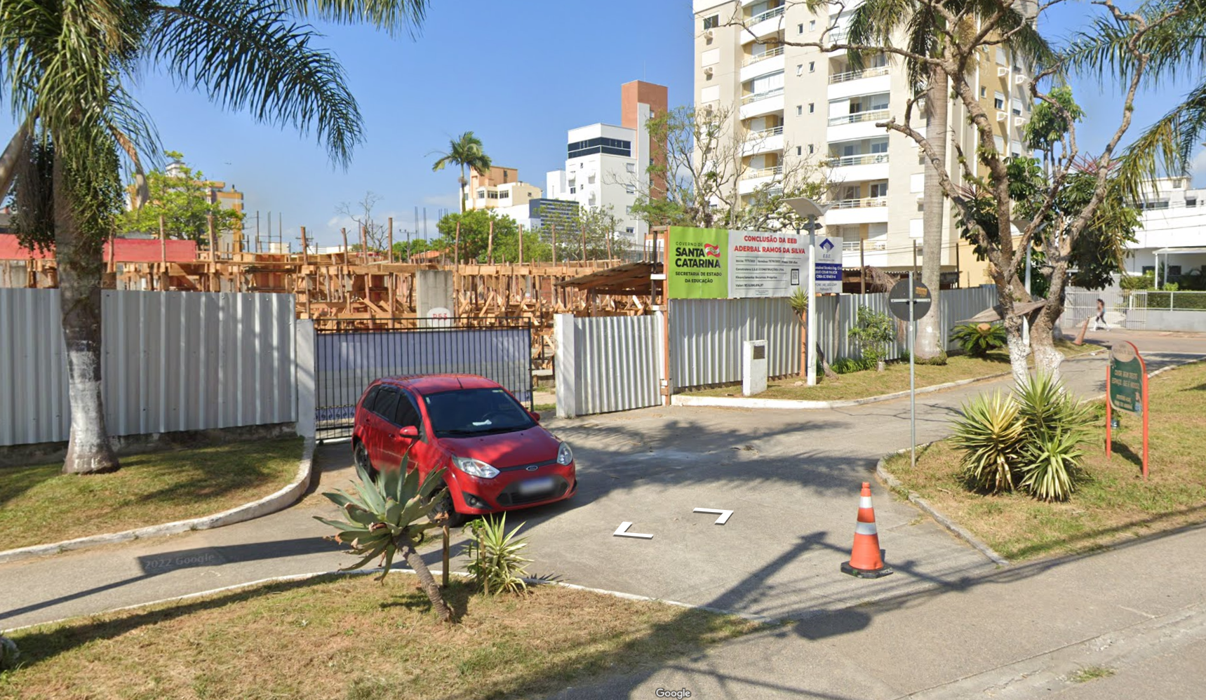 As obras no EEB Aderbal Ramos da Silva, no bairro Estreito, em Florianópolis, estão paradas desde 2018. O projeto era para ser entregue em 2019, mas a empresa vigente desistiu após ter concluído 30% da reforma. Em janeiro deste ano, uma nova empreiteira foi contratada pelo Governo do Estado para dar sequência à obra — que custaria R$ 8 milhões — mas a Prefeitura da Capital paralisou as reformas por falta de alvará da empresa.