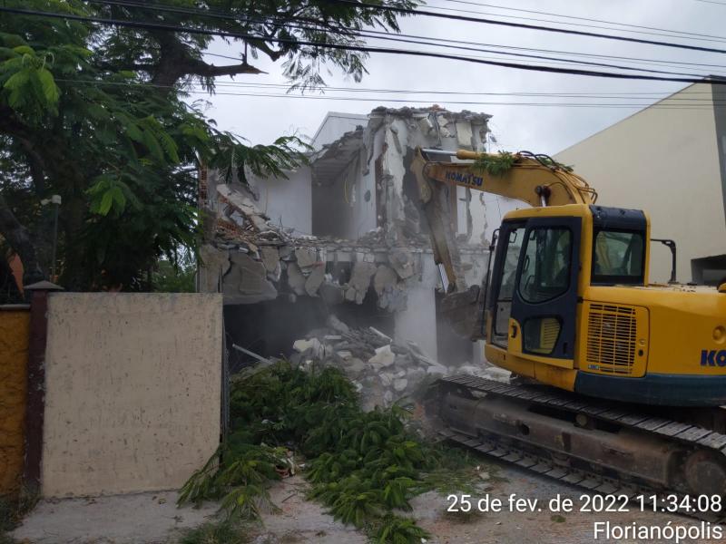 A Secretaria Municipal de Desenvolvimento Urbano (SMDU) de Florianópolis fez a demolição de três construções no Sul da Ilha nesta sexta-feira (25). Um prédio de três andares e uma obra no baldrame foram demolidos parcialmente, no Ribeirão da Ilha. No bairro Campeche, uma casa de dois pavimentos foi demolida completamente.