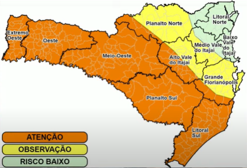 O órgão também emite nível de atenção para essas regiões para ocorrências por conta da chuvas e também para a área mais ao oeste do Planalto Norte, do Alto Vale do Itajaí e para os municípios mais ao Sul da Grande Florianópolis. Grande parte do Planalto Norte, Alto Vale do Itajaí e Grande Florianópolis, assim como o oeste do Médio Vale do Itajaí, exigem observação.