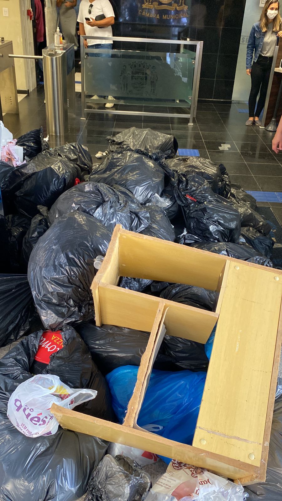 Manifestantes recolheram lixo que estava na rua, para recolhimento pela empresa terceirizada, e espalharam em frente da Câmara Municipal de Florianópolis (CMF), na manhã desta sexta-feira (11). Em seguida, alguns sacos foram rasgados e jogados dentro do prédio. No momento do ato, algumas pessoas eram atendidas por funcionários na recepção. Os manifestantes estavam em uma passeata da Comcap, com carros de som, antes de se dirigirem à CMF.