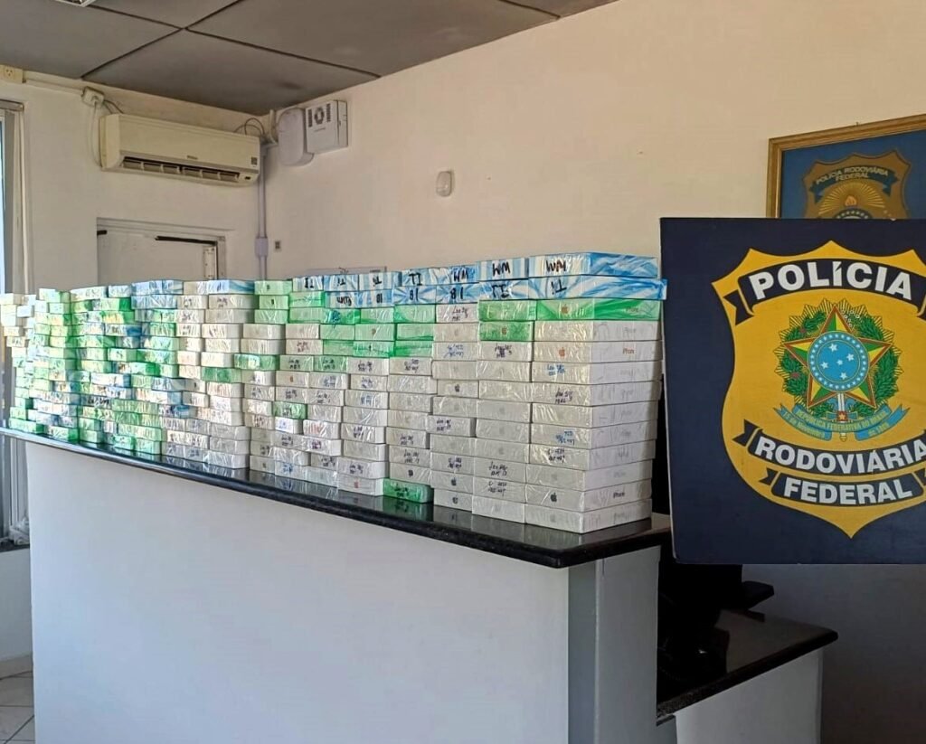 Os agentes abordaram um veículo contendo centenas de aparelhos escondidos em mochilas no interior do compartimento de passageiros. Após a contagem, foram apreendidos 475 celulares modelo iPhone, além de 11 smartwatches, cinco tablets e 38 relógios de pulso.