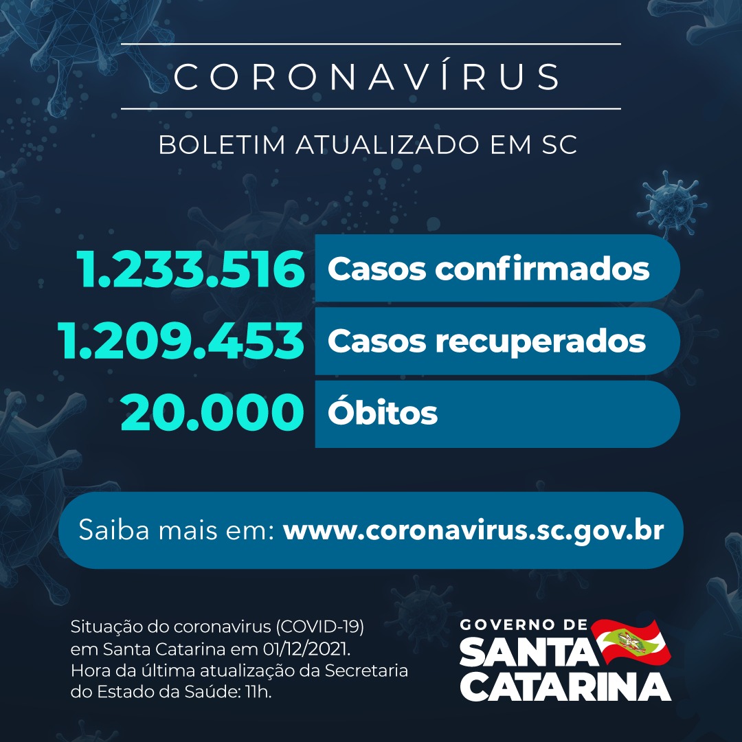 Santa Catarina alcançou a marca de 20 mil mortos pela Covid-19 nesta quarta-feira (1º). Os dados foram divulgados pela Secretaria de Estado da Saúde. Foram 8 óbitos a mais desde o boletim de terça-feira (30).