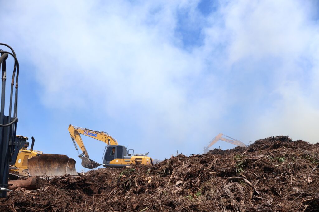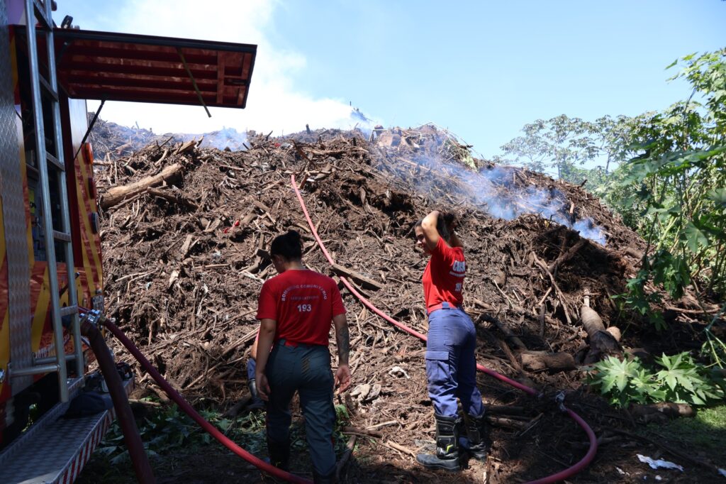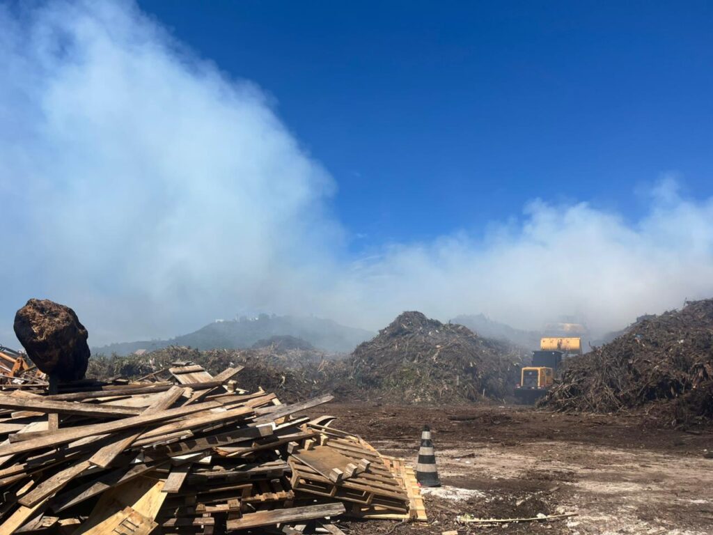 O incêndio que tomou conta de entulho de madeira, na sede da Comcap Itacorubi, em Florianópolis, continua ativo mesmo 48 horas após o início do fogo. Bombeiros e servidores da companhia continuam tentando reprimir as chamas e a fumaça.