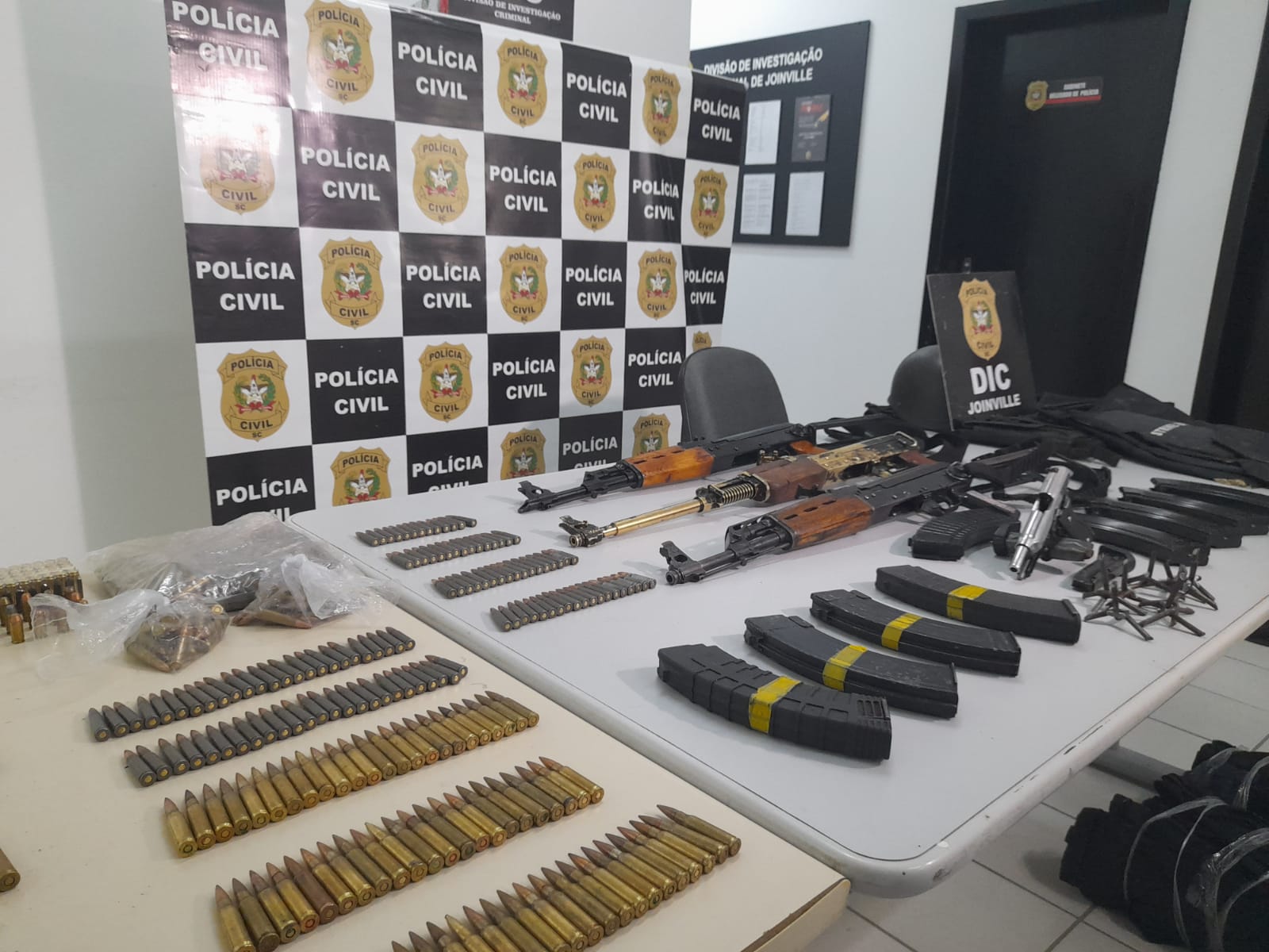 Os agentes da DIC/PCSC prenderam em flagrante três suspeitos de São Paulo, em um galpão em Araquari, às margens da BR-280. Ali foram localizados três fuzis, uma pistola, carregadores, uma alta quantidade de munição, dezenas de bananas de dinamite, miguelitos, coletes balísticos, carregadores e seis carros de luxo blindados com placas frias.