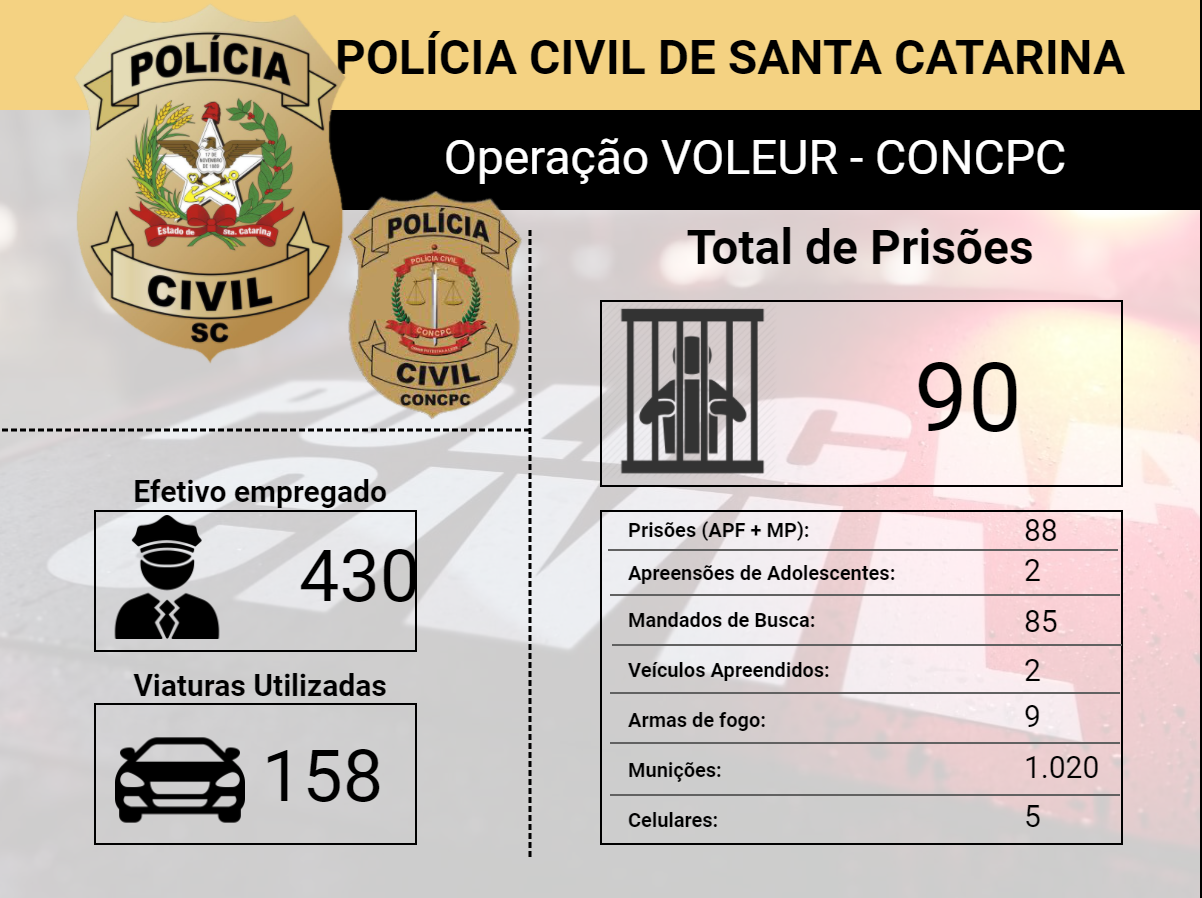 A Polícia Civil de Santa Catarina participou nesta quarta-feira (17) da operação nacional “Voleur”, realizada em 26 Estados e no Distrito Federal em repressão aos crimes contra o patrimônio. Em Santa Catarina, a Polícia empregou um efetivo de 430 policiais civis e realizou 90 prisões, entre autos de prisão e flagrante e cumprimento de mandados de prisão, além da apreensão de dois adolescentes pelo Estado. Foram cumpridos ainda 85 mandados de busca e apreensão, dois veículos, nove armas de fogo, 1.020 munições e cinco celulares. As ações são resultados de investigações coordenadas por delegacias especializadas e de Comarcas em diferentes regiões do Estado sobre delitos como roubos, furtos e extorsão.