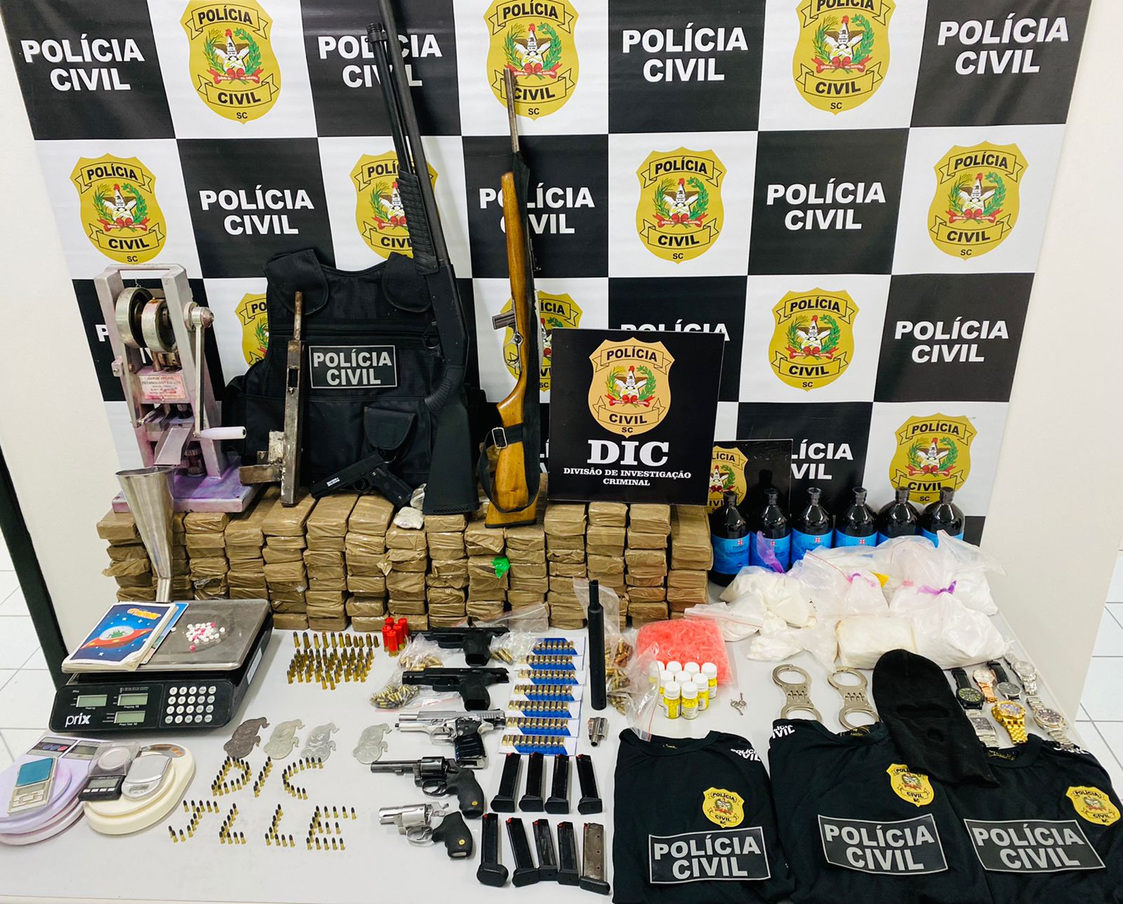 Os agentes da DIC/PCSC de Joinville cumpriram mandados de prisão temporária e de busca e apreensão, sendo recolhidas três pistolas, dois revólveres, duas espingardas, uma submetralhadora caseira, alta quantidade de munição de diversos calibres e um supressor de ruídos, além de camisetas com emblemas da Polícia Civil e coletes balísticos.
