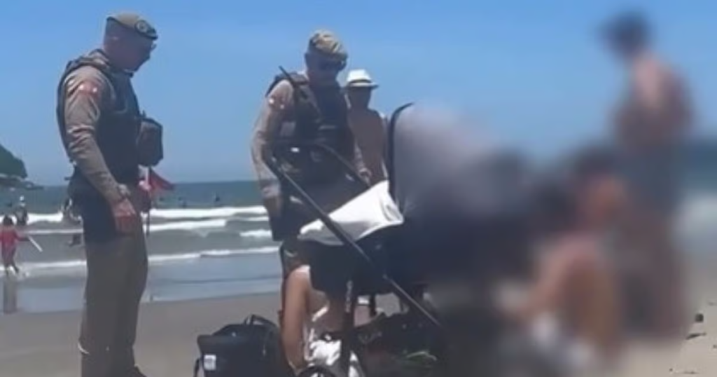 Uma família foi flagrada ouvindo música alta em uma caixa de som enquanto um bebê dentro de um carrinho fica exposo ao sol intenso da praia de Balneário Camboriú nesta sexta-feira (26).