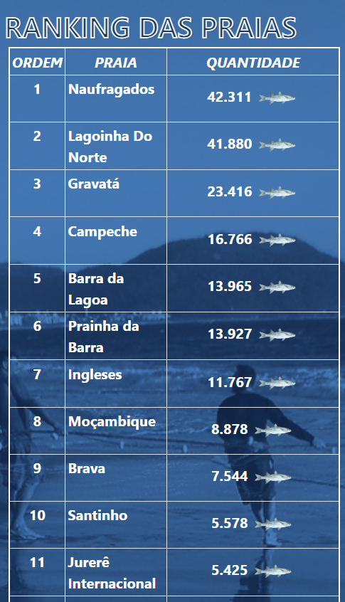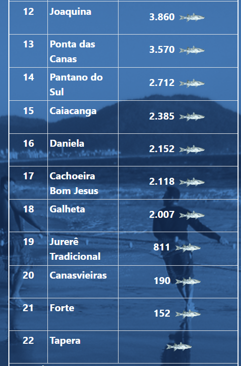 De acordo com dados do Tainhômetro, divulgados na manhã desta terça-feira (3), a praia de Naufragados, no Sul da Ilha, é a que registrou o maior número de tainhas pescadas ao longo dessa safra. No local, já foram capturados 42.311 peixes. Outra praia que ultrapassou a marca dos 40 mil foi a Lagoinha do Norte, com 41.880. Ao todo, o município já registrou 210.964 tainhas pescadas desde o dia 1º de Maio. Confira o Tainhômetro completo: