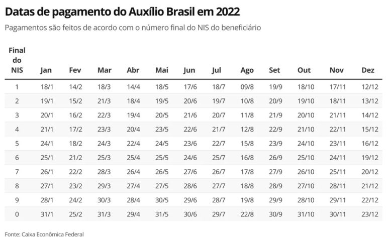 O primeiro pagamento de R $600 em agosto ocorrerá no dia 5. O Auxílio Brasil é pago de acordo com o dígito final do NIS (Número de Identificação Social) do beneficiário.