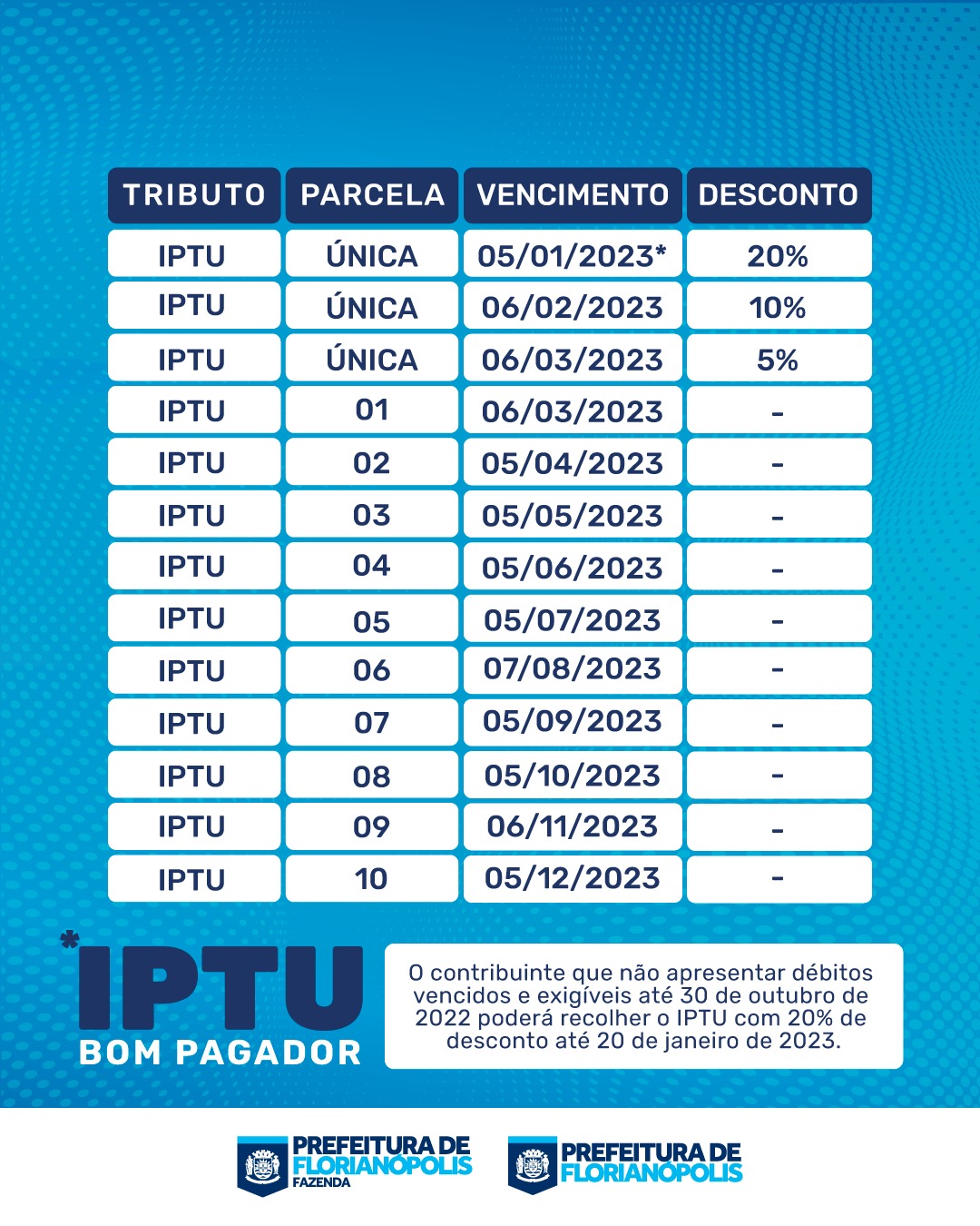 A oportunidade dos contribuintes de Florianópolis pagarem o IPTU, em cota única, tem prazo para terminar na próxima segunda-feira (6). A Prefeitura de Florianópolis, por meio da Secretaria da Fazenda, reforça que os interessados terão desconto de 5% caso quitem o tributo até a data informada.