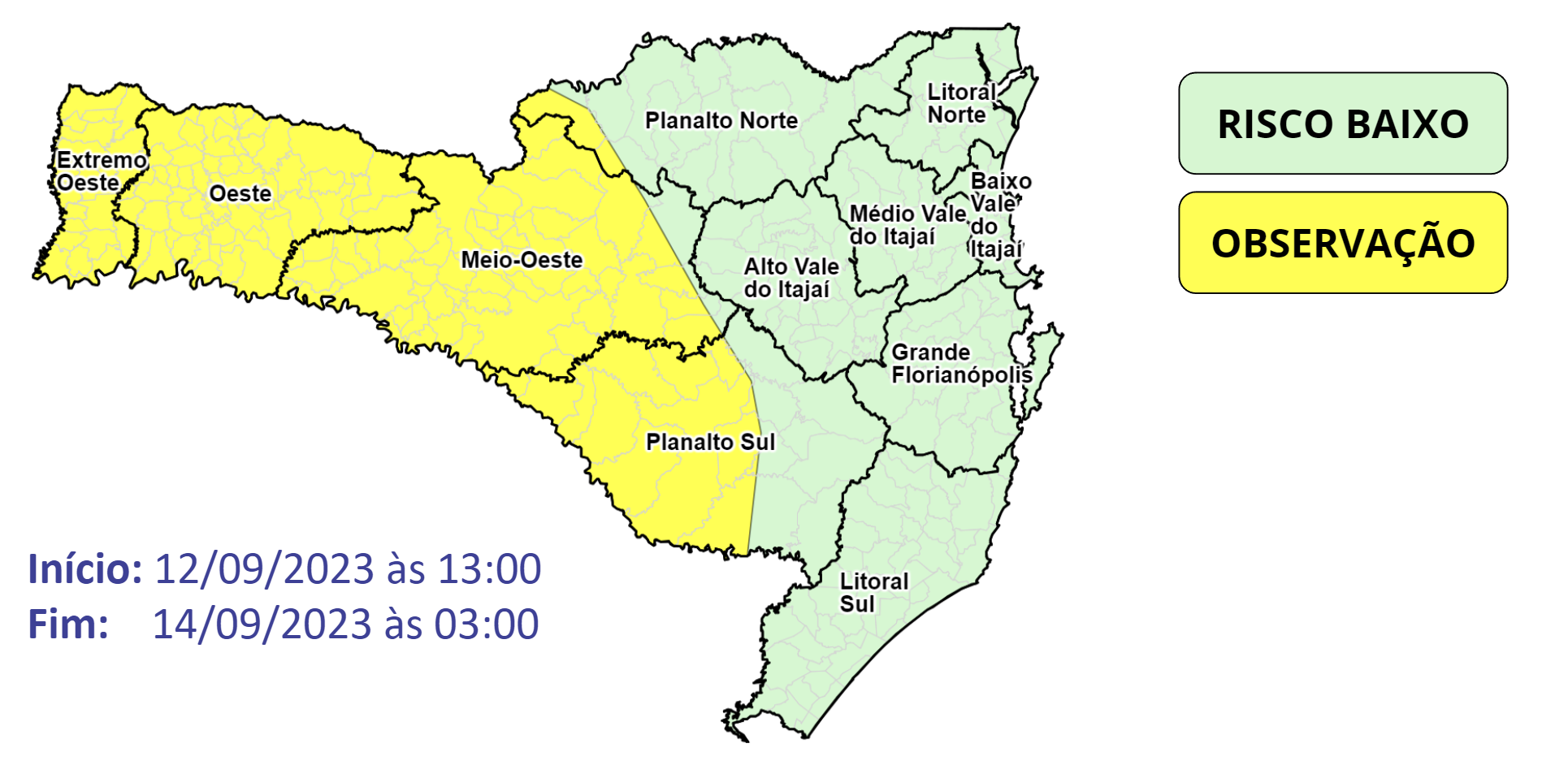 Na quarta-feira (13), a passagem de uma frente fria e a formação de um ciclone na costa favorece a ocorrência de temporais, que também dão início no Oeste pela manhã, e avançam para as demais áreas ao longo do dia, podendo se estender até a madrugada de quinta-feira. Por vezes, a chuva pode ser intensa, e acumular altos volumes em um curto período de tempo.