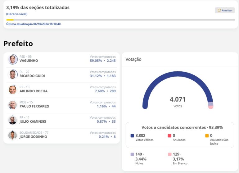 Na sequência, aparecem os candidatos Ricardo Guidi (PL), com 31,12% dos votos computados, e Arlindo Rocha (PT), com 7,60%.