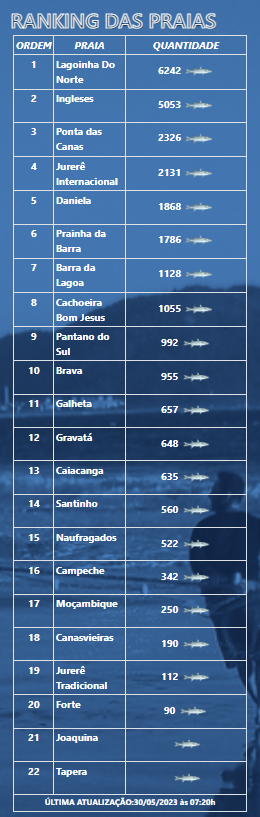 A praia da Lagoinha do Norte foi a que mais registrou, com 6242 tainhas. Em segundo lugar, está a Praia dos Ingleses com 5.053 peixes. Confira a lista completa disponibilizada pelo Tainhômetro.
