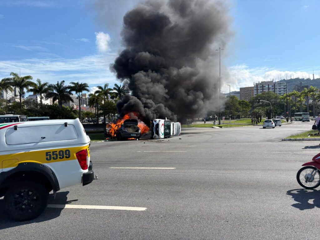 Um acidente paralisou parte do centro de Florianópolis na manhã desta quarta-feira (4), por volta das 9h da manhã. Um carro Chevrolet Prisma pegou fogo em rua próxima ao TICEN (Terminal de Integração do Centro) e à Passarela Nego Quirido, após colisão com veículo de transplante de órgãos.